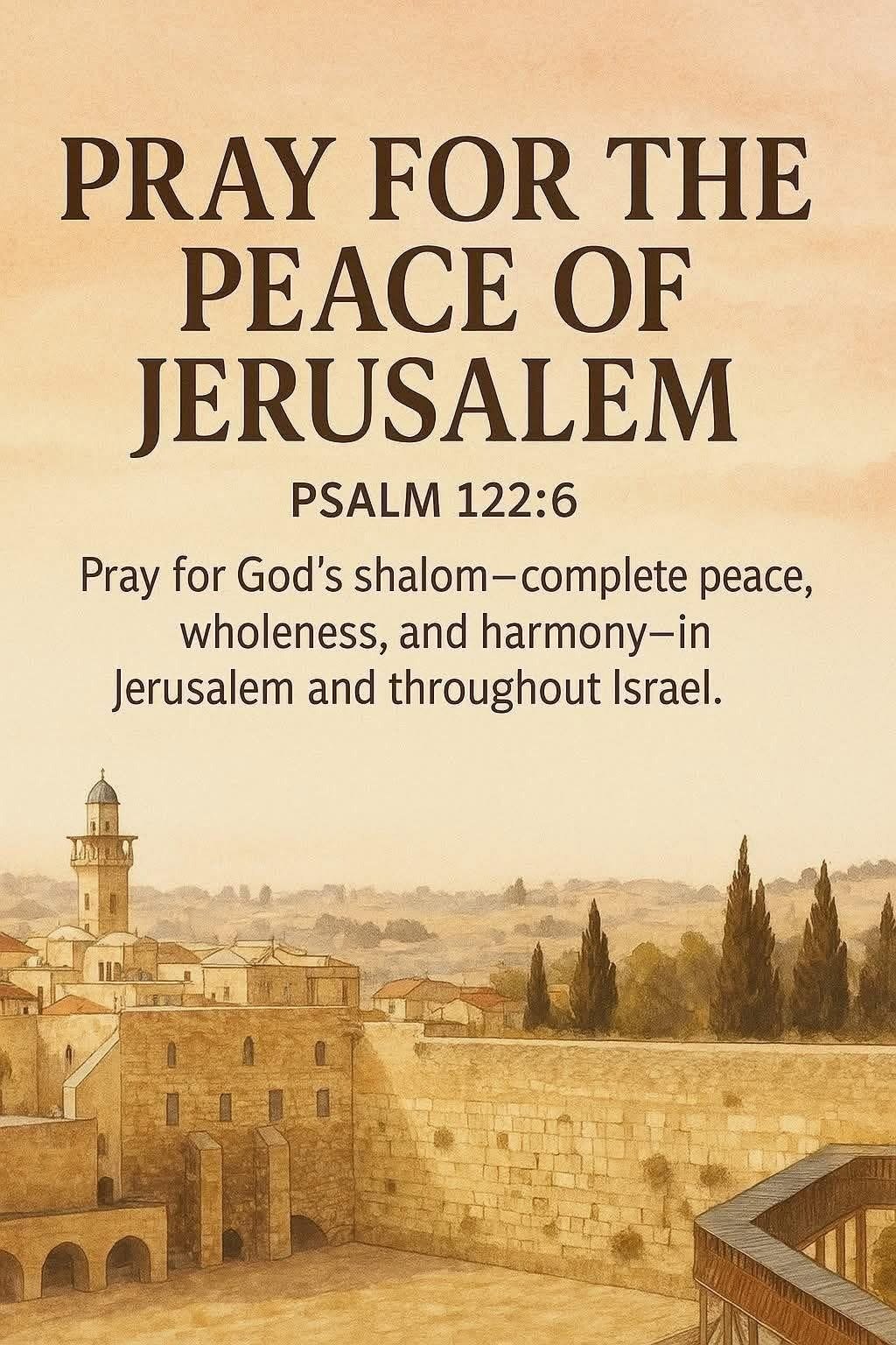 "Pray for the peace of Jerusalem. May they prosper who love you. May peace be within your walls, And prosperity within your palaces.” Psalm 122:6,7